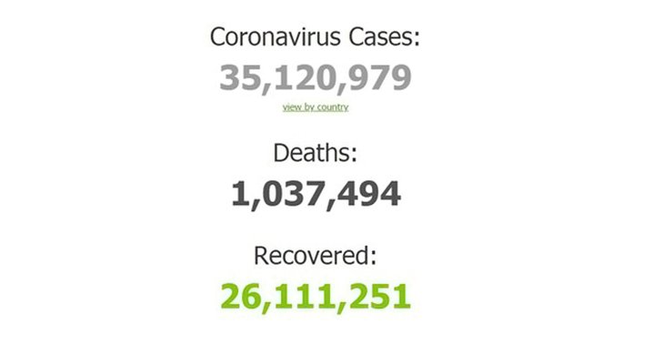 เว็บไชต์ Worldometers รายงานสถานการณ์ไวรัสโควิด-19 ประจำวันที่ 4 ตุลาคม 2563 ช่วงเวลาประมาณ 07.40 น. ตามเวลาประเทศไทย พบมีผู้ป่วยติดเชื้อทั่วโลกรวม 35,120,979 ราย เพิ่มขึ้น 293,076 ราย เสียชีวิต 1,037,494 ราย เพิ่มขึ้น 4,761 ราย รักษาหาย 26,111,251 ราย