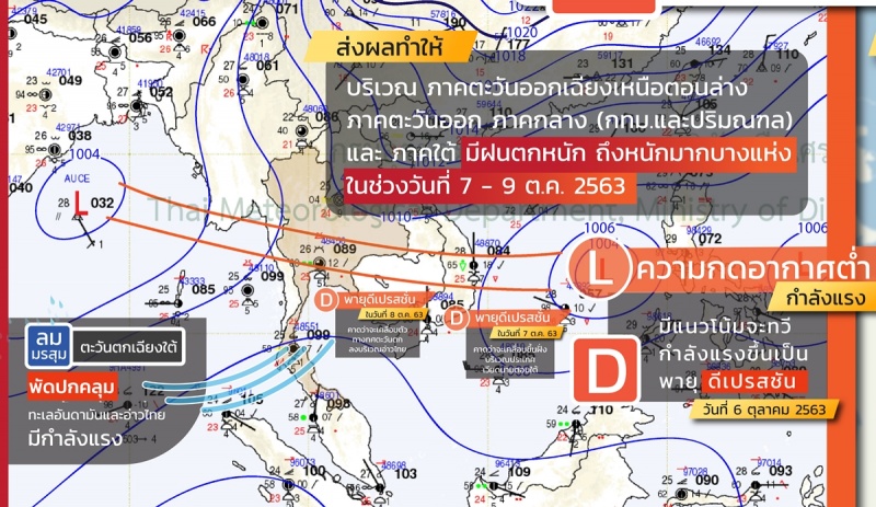 ช่วงวันที่ 7 - 9 ตุลาคม มีฝนตกหนักถึงหนักมากบางแห่งบริเวณภาคตะวันออกเฉียงเหนือตอนล่าง ภาคตะวันตก และภาคใต้