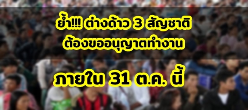 | • กระทรวงแรงงาน ย้ำ! เดือนสุดท้าย ต่างด้าว 3 สัญชาติ ต้องขออนุญาตทำงานภายใน 31 ต.ค. นี้ |