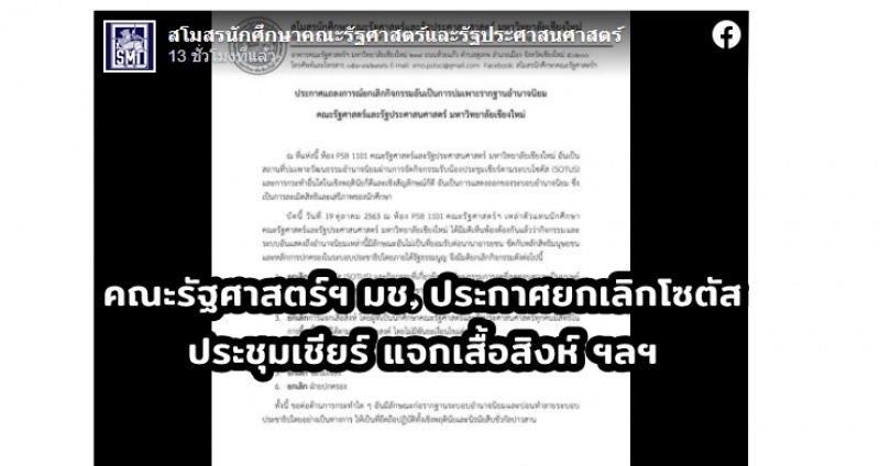 วานนี้ สโมสรนักศึกษาคณะรัฐศาสตร์และรัฐประศาสนศาสตร์ ได้ประกาศประกาศแถลงการณ์ยกเลิกกิจกรรมอันเป็นการบ่มเพาะรากฐานอำนาจนิยม คณะรัฐศาสตร์และรัฐประศาสนศาสตร์ มหาวิทยาลัยเชียงใหม่ เป็นข้อความดังนี้