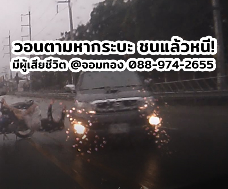 หากผู้ใดพบเห็นหรือ มีข้อมูลกล้องหน้ารถ หรือภาพถ่ายที่จะทำให้ทราบตัวผู้ขับขี่รถคันดังกล่าวขอท่าน แจ้ง พ.ต.ท.ชานนท์ ทองอินทร์ พนักงานสอบสวนสภ.จอมทอง โทร 088-974-2655 หรือ 053-341193 เพื่อจะได้ติดตามตัวมารับผิดชอบต่อฝ่ายผู้สูญเสียต่อไป