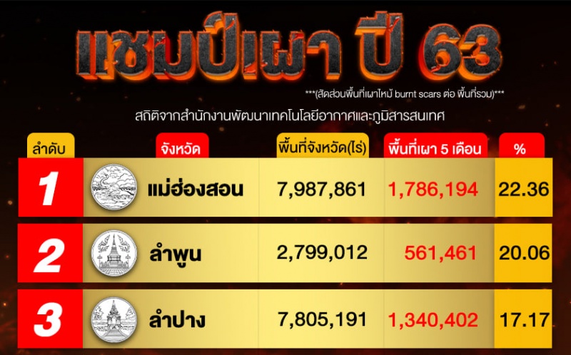 แม่ฮ่องสอนแชมป์ ลำพูนรองแชมป์ เผาปี2563 (สัดส่วน% พื้นที่เผา/พื้นที่ทั้งหมด)