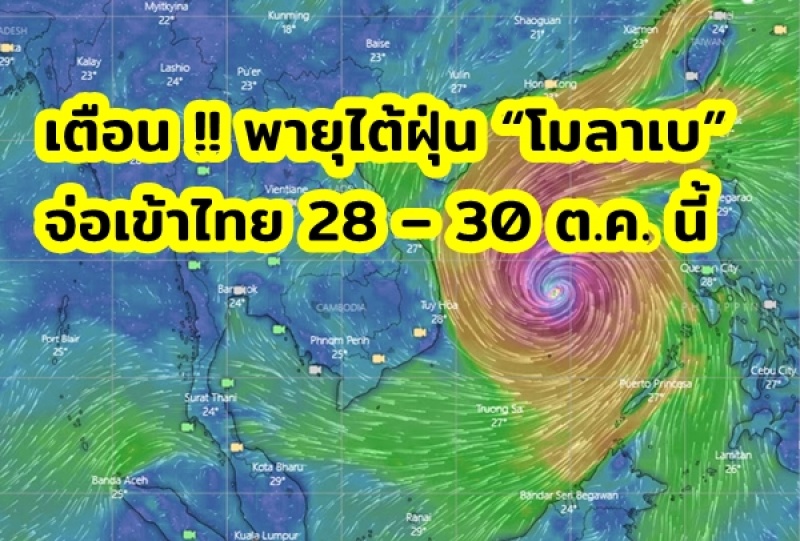 แจ้งเตือนพี่น้องประชาชนครับ...ช่วงวันที่ 28 – 30 ต.ค. 63 ขอให้เตรียมรับมือกับพายุไต้ฝุ่น “โมลาเบ”จากบริเวณทะเลจีนใต้ตอนกลาง ซึ่งจะส่งผลให้พื้นที่ภาคเหนือตอนล่าง ภาคตะวันออกเฉียงเหนือ ภาคตะวันออก ภาคกลาง และภาคใต้ มีฝนตกหนักและมีลมแรง