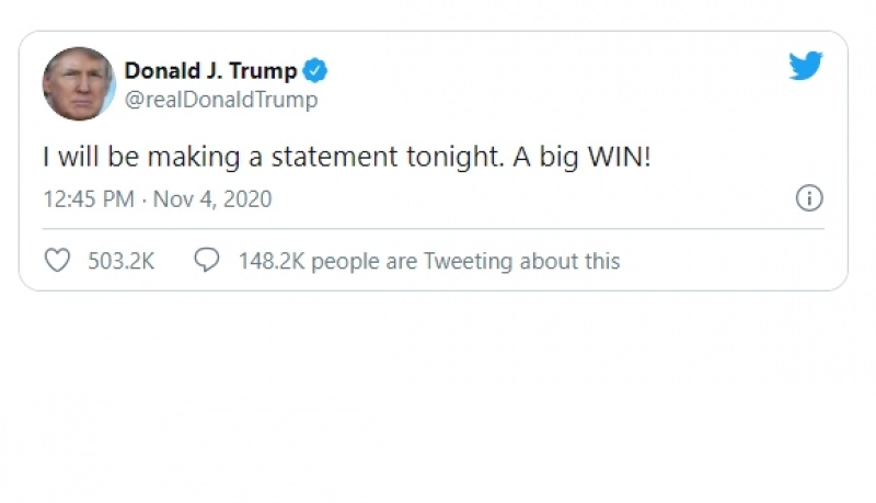 นายโดนัลด์ ทรัมป์ โพสต์ลงในทวิตเตอร์เมื่อเวลาประมาณ 13.00 น. วันนี้ (4 พ.ย.) ว่า เตรียมแถลงในคืนนี้ เกี่ยวกับการรับชัยชนะครั้งยิ่งใหญ่ นั่นน่าจะหมายความถึง ชัยชนะในการเลือกตั้ง เป็นประธานาธิบดี ของ อเมริกา อีกสมัย