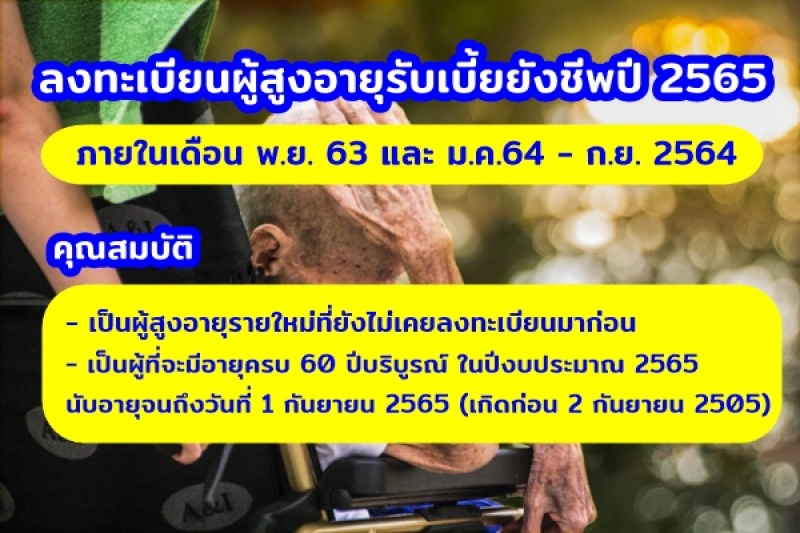 | • ผู้สูงอายุลงทะเบียนรับเบี้ยยังชีพปี 2565 ภายในเดือน พ.ย. 63 และ ม.ค.64 - ก.ย. 2564 |