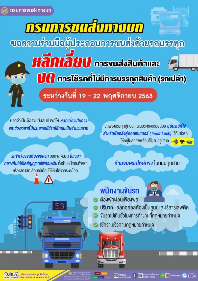 กรมการขนส่งทางบก ขอความร่วมมือผู้ประกอบการขนส่งด้วยรถบรรทุก หลีกเลี่ยงการขนส่งสินค้า และงดการใช้รถที่ไม่มีการบรรทุกสินค้า (รถเปล่า) ในช่วงวันหยุดต่อเนื่อง 19-22 พฤศจิกายน 2563 เพื่อป้องกันและลดความเสี่ยงอุบัติเหตุที่เกิดจากรถบรรทุก