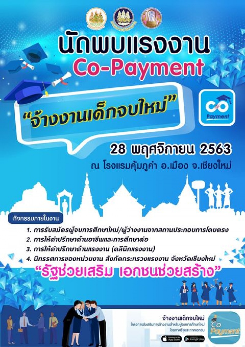 นางฐิติมา นราพงศ์ จัดหางานจังหวัดเชียงใหม่ เปิดเผยว่า สำนักงานจัดหางานจังหวัดเชียงใหม่ กำหนดจัดกิจกรรมนัดพบแรงงานผู้จบการศึกษาใหม่ (Co-Payment) ในวันเสาร์ที่ 28 พฤศจิกายน 2563 ตั้งแต่เวลา 08.30 – 16.30 น. ณ โรงแรมคุ้มภูคำ ถนนคันคลองชลประทาน ตำบลช้างเผือก อำเภอเมืองเชียงใหม่ จังหวัดเชียงใหม่ โดยมีวัตถุประสงค์เพื่อเพิ่มโอกาสการมีงานทำให้แก่ผู้จบการศึกษาใหม่ที่ได้รับผลกระทบจากสถานการณ์การแพร่ระบาดของโรคโควิด-19 โดยกิจกรรมภายในงาน มีการรับสมัครงานและสัมภาษณ์งานกับนายจ้างโดยตรง จำนวนกว่า 50 แห่ง ตำแหน่งงานรองรับผู้ว่างงานมากกว่า 1,000 อัตรา นอกจากนี้ ยังมีกิจกรรมให้คำแนะนำปรึกษาเกี่ยวกับการสมัครงาน การสัมภาษณ์งาน การให้บริการ ของหน่วยงานสังกัดกระทรวงแรงงานจังหวัดเชียงใหม่ อีกด้วย