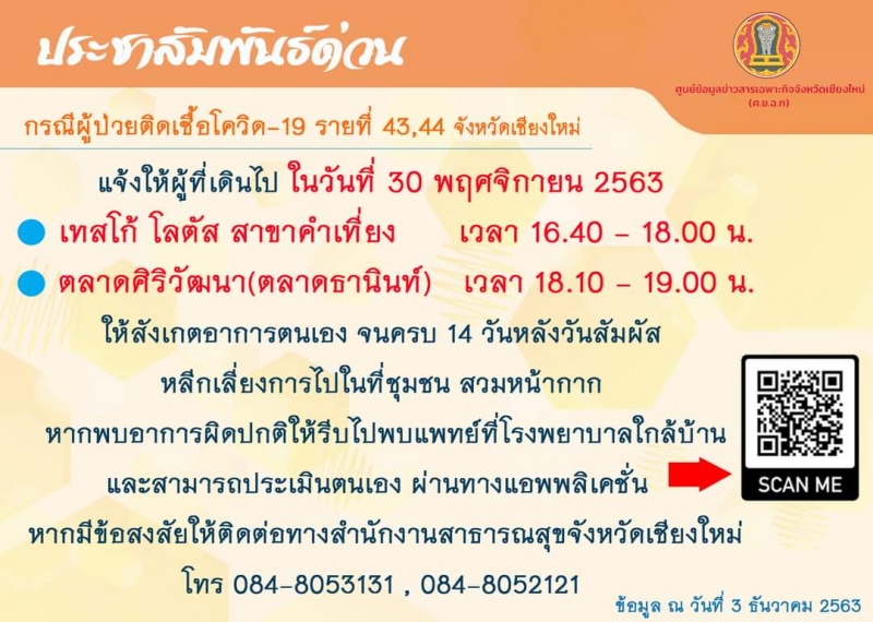 ทั้งนี้ ขอประชาสัมพันธ์ให้กับประชาชนที่เดินทางไปยังสถานที่ 2 แห่ง ตามไทม์ไลน์ของผู้ป่วยรายนี้ ในวันที่ 30 พ.ย. 2563 เวลา 16.40-18.00 น. ที่เทสโก้โลตัส สาขาคำเที่ยง และ เวลา 18.10-19.00 น. ตลาดศิริวัฒนา(ตลาดธานินท์) สามารถประเมินตนเอง และลงทะเบียนเพื่อรับการติดต่อจากเจ้าหน้าที่ในการตรวจสอบประวัติและนัดหมายการตรวจได้ จากแอพพลิเคชั่น แบบคัดกรองตนเองสำหรับผู้สงสัยติดเชื้อไวรัสโคโรนา 2019 (https://cmsdm.net/Self-ScreeningV2/index.php) ทั้งนี้หากท่านมีประวัติเดินทางข้างต้น ให้สังเกตอาการตนเองจนกระทั่งครบ 14 วันหลังวันสัมผัส หลีกเลี่ยงการไปในที่ชุมนุมชน ปิดหน้ากากทุกครั้งเมื่อออกจากบ้าน และหากพบอาการผิดปกติให้รีบพบแพทย์ที่ีสถานพยาบาลใกล้บ้าน