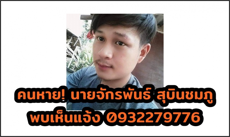 หากท่านใดพบเห็น นายจักรพันธ์ สุปินชมภู โปรดแจ้ง โทร.0932279776 ญาติเป็นห่วงมาก