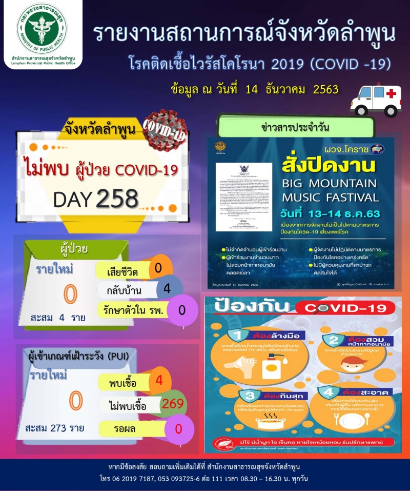 วันนี้ 14 ธันวา 63 จังหวัดลำพูน ได้รายงานสถานการณ์โควิด19 ประจำวันของจังหวัดลำพูน ไม่มีผู้เข้าเกณฑ์เฝ้าระวัง(pui) และไม่มีผู้รอผลตรวจ