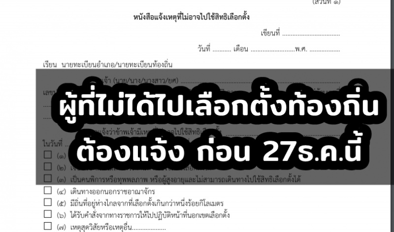 | • ย้ำ!ผู้ที่ไม่ได้ไปเลือกตั้งนายก-ส.อบจ. ต้องแจ้ง ก่อน 27ธ.ค.นี้ ด้วยตนเองหรือทาง ปณ. |