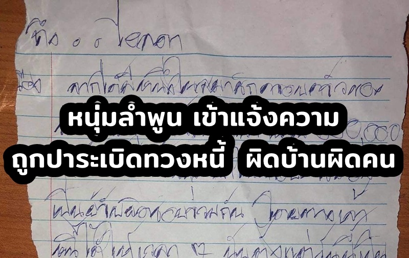โดย หนุ่มรายนี้ อยู่หมู่บ้านกิ่วมื่น ต.มะเขือแจ้ อ.เมืองลำพูน เปิดเผยว่าเมื่อคืน วันที่ 14 ธ.ค.2563 เวลาประมาณ 21.30 น. ได้ยินเสียงประทัดดังขึ้น ที่หน้าบ้าน จึงรีบออกมาดูพบว่าที่หน้าบ้านมีจดหมายใบหนึ่งเขียนด้วยลายมือตกอยู่ จึงหยิบขึ้นมาดูในจดหมายเขียนถึง "ไอลดา" อ่านแล้วพอจับใจความได้ว่ามาทวงหนี้เป็นจำนวน 390,000 บาท และมีข้อความข่มขู่ไว้