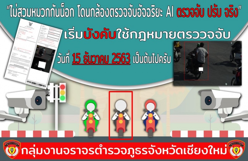 ตำรวจภูธรจังหวัดเชียงใหม่ เริ่มใช้กล้องอัจฉริยะระบบ AI ตรวจจับผู้ขับขี่รถจักรยานยนต์  ไม่สวมหมวกกันน๊อค ปรับจริงทั้งผู้ขับขี่และผู้ซ้อนท้าย เสริมสร้างประสิทธิภาพการป้องกันและลดอุบัติเหตุทางถนนในระดับพื้นที่  ตั้งแต่วันที่ 15 ธันวา 63 เป็นต้นไป