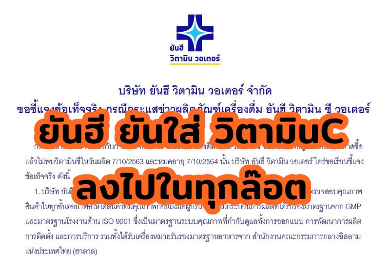วานนี้ เพจ ยันฮี วิตามิน วอเตอร์ ได้ชี้แจง กรณีที่มีกระแสข่าวเกี่ยวกับการตรวจสอบวิตามินในเครื่องดื่ม ยันฮี วิตามิน ซี วอเตอร์ โดยศูนย์ทดสอบฉลากซื้อแล้วไม่พบวิตามิน บริษัท ยันฮี วิตามิน ซี วอเตอร์ ใคร่ขอเรียนชี้แจงข้อเท็จจริงดังนี้