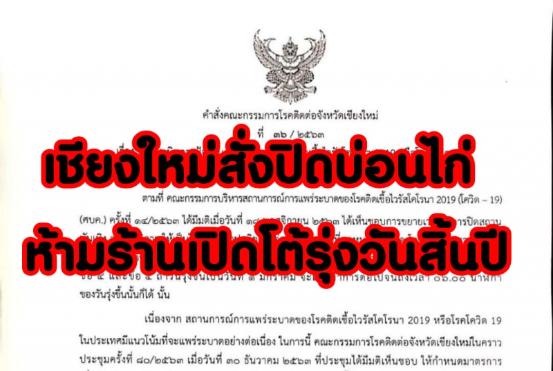 สั่งปิดบ่อนไก่ ห้ามร้านเปิดโต้รุ่งวันส่งท้ายปี คำสั่งจังหวัดเชียงใหม่ที่ 36/2563 เริ่มบังคับใช้ 30 ธ.ค. 63 เป็นต้นไป ผู้ใดฝ่าฝืนมีทั้งโทษจำและโทษปรับ