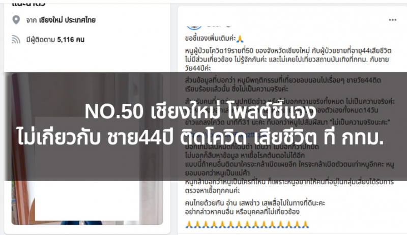 | • NO.50 เชียงใหม่ โพสต์ชี้แจง ไม่เกี่ยวกับ ชาย44ปี ติดโควิด เสียชีวิต ที่ กทม. |