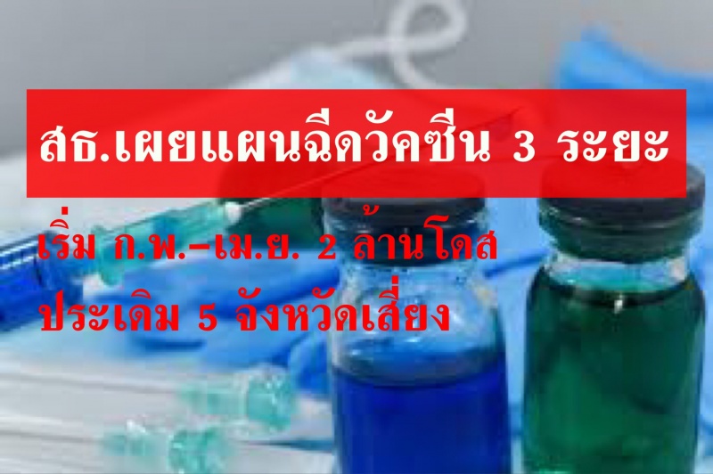 | • สธ.เผยแผนฉีดวัคซีน 3 ระยะ เริ่ม ก.พ.-เม.ย. 2 ล้านโดส ประเดิม 5 จังหวัดเสี่ยง |