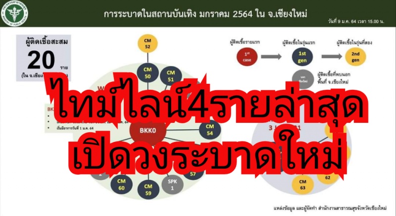 - ผู้ป่วยโควิด-19 รายที่ 60 (CM 60) ของจังหวัดเชียงใหม่ ชายไทย อายุ 30 ปี ที่อยู่ อ.เมือง จ.เชียงใหม่ อาชีพธุรกิจส่วนตัว ประวัติเดินทางไปยังร้านวอร์มอัพ ในคืนวันที่ 31 ธ.ค. 63 โดยนั่งโต๊ะเดียวกันกับผู้ป่วยโควิด-19 รายที่ 59 ของจังหวัดเชียงใหม่ ไม่มีอาการผิดปกติ ขณะนี้รับรักษาตัวห้องแยกความดันลบ โรงพยาบาลสันทราย