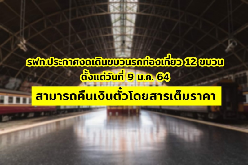 การรถไฟแห่งประเทศไทย ประกาศงดเดินขบวนรถท่องเที่ยว จำนวน 12 ขบวน ตั้งแต่วันที่ 9 มกราคม 2564 และขบวนรถเชิงพาณิชย์ จำนวน 30 ขบวน ตั้งแต่วันที่ 13 มกราคม – 28 กุมภาพันธ์ 2564 ผู้โดยสารสามารถนำตั๋วโดยสารมาติดต่อขอรับเงินคืนได้เต็มราคาเป็นกรณีพิเศษทุกสถานีทั่วประเทศ ทั้งนี้ เป็นไปตามนโยบายของ ศบค. เพื่อหลีกเลี่ยงการเดินทางในช่วงการแพร่ระบาดของไวรัสโคโรนา 2019 (โควิด – 19)