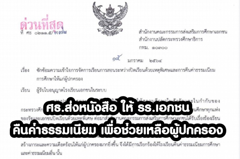 | • ศธ.ส่งหนังสือ ให้ รร.เอกชน คืนค่าธรรมเนียม เพื่อช่วยเหลือผู้ปกครอง |