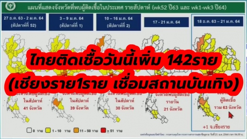 นพ.ทวีศิลป์ วิษณุโยธิน โฆษก ศบค. แถลงสถานการณ์โควิด-19 พบผู้ติดเชื้อวันนี้ (21 ม.ค. 64) พบผู้ติดเชื้อเพิ่มขึ้นอีก 142 ราย ไม่มีรายงานผู้เสียชีวิต เป็นผู้ติดเชื้อในประเทศถึง 125  ราย  โดย มีจังหวัดที่ พบเป็นเชื้อเพิ่มที่น่าสนใจคือ จ.เชียงราย