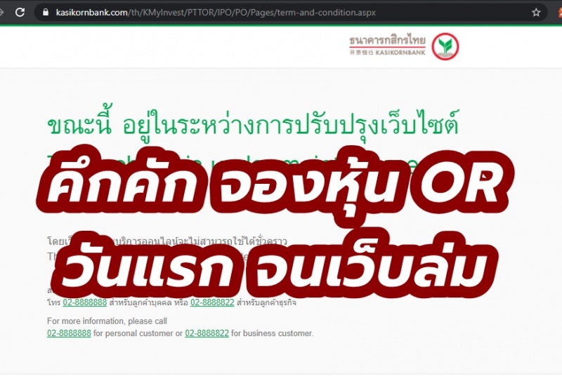 วันนี้ (24 ม.ค.63) เปิดให้มีการจองหุ้น OR วันแรก ซึ่งในความจริงสามารถจองได้ถึงเที่ยงวันของวันที่ 2 ก.พ. 64 แต่ปรากฏว่า เช้านี้ ทั้ง3 ธนาคารที่เปิดให้จองคือ ธนาคารกรุงเทพ กสิกรไทย และ กรุงไทย เว็บล่ม! ทั้งหมด และกำลังดำเนินการปรับปรุงแก้ไข