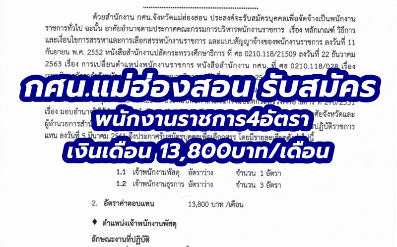 | • กศน.แม่ฮ่องสอน พนักงานราชการ4อัตรา เงินเดือน 13,800บาท/เดือน |