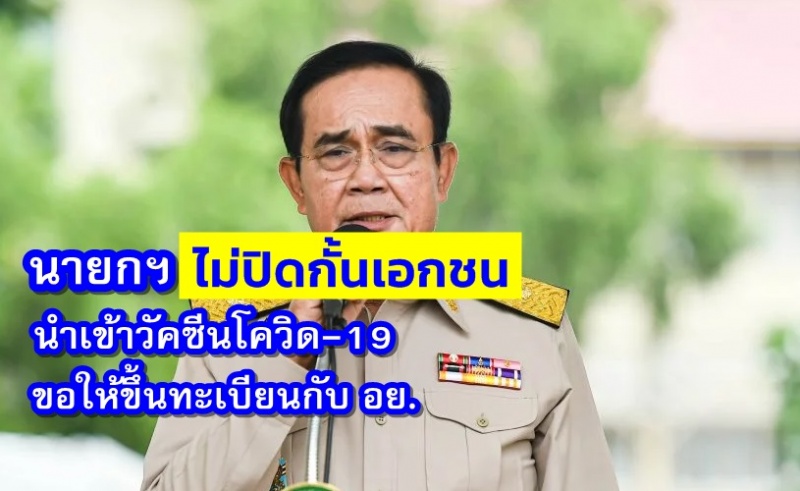นายกฯ ไม่ปิดกั้นเอกชนนำเข้าวัคซีนโควิด-19 ขอให้ขึ้นทะเบียนกับ สำนักงานคณะกรรมการอาหารและยา (อย.) เพื่อมั่นใจในความปลอดภัยของประชาชน
