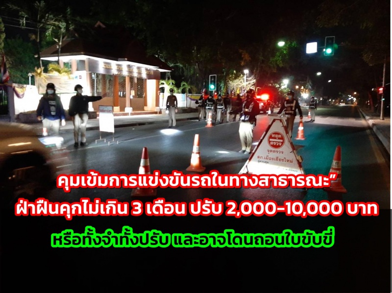 | • ตำรวจเชียงใหม่คุมเข้มการแข่งขันรถในทางสาธารณะ ฝ่าฝืนคุกไม่เกิน 3 เดือน ปรับ 2,000-10,000 บาท |
