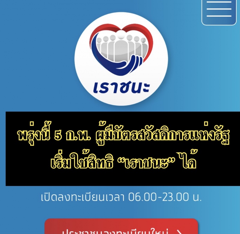 | • พรุ่งนี้ 5 ก.พ. ผู้มีบัตรสวัสดิการแห่งรัฐ เริ่มใช้สิทธิ เราชนะ ได้ |