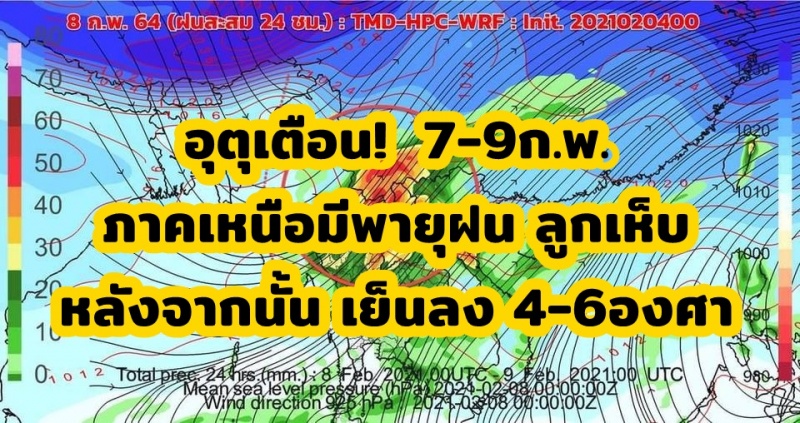 ในช่วงวันที่ 7- 9 กุมภาพันธ์ 2564 ประเทศไทยตอนบนจะมีพายุฝนฟ้าคะนองกับมีลมกระโชกแรง และมีลูกเห็บตกบางพื้นที่ในภาคเหนือและภาคตะวันออกเฉียงเหนือ หลังจากนั้นอุณภูมิจะลดลง 4-6 องศาเซลเซียส โดยพายุฝนฟ้าคะนองจะเริ่มมีผลกระทบในภาคเหนือวันที่ 7 กุมภาพันธ์ 2564 ส่วนภาคตะวันออกเฉียงเหนือ ภาคกลาง ภาคตะวันออก รวมทั้งกรุงเทพมหานครและปริมณฑล มีผลกระทบวันที่ 8-9 กุมภาพันธ์ 2564 ขอให้ประชาชนในบริเวณดังกล่าวระวังอันตรายจากพายุฝนฟ้าคะนองที่จะเกิดขึ้น โดยหลีกเลี่ยงการอยู่ในที่โล่งแจ้ง ใต้ต้นไม้ใหญ่ และป้ายโฆษณาที่ไม่แข็งแรง รวมถึงระวังอันตรายจากฟ้าผ่า สำหรับเกษตรกรควรเตรียมการป้องกันและระวังความเสียหายที่จะเกิดต่อผลผลิตทางการเกษตรไว้ด้วย