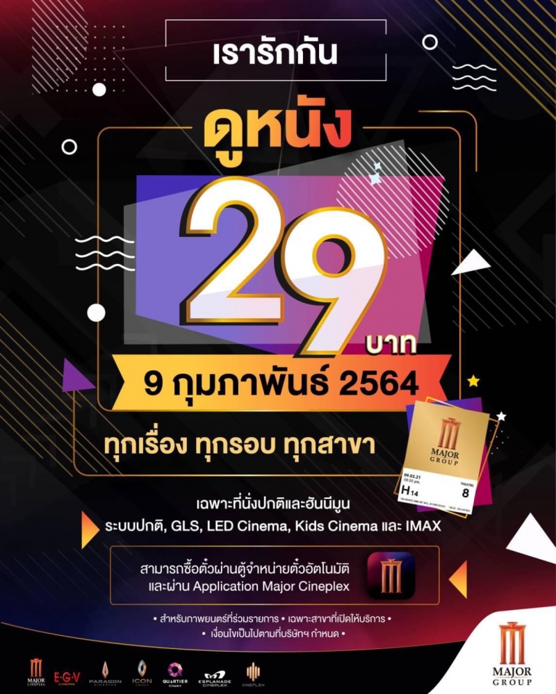1. ลูกค้าซื้อบัตรชมภาพยนตร์ราคา 29 บาท สำหรับภาพยนตร์รอบฉายวันที่ 9 กุมภาพันธ์ 2564 ทุกเรื่อง ทุกรอบ ทุกสาขาทั่วประเทศ