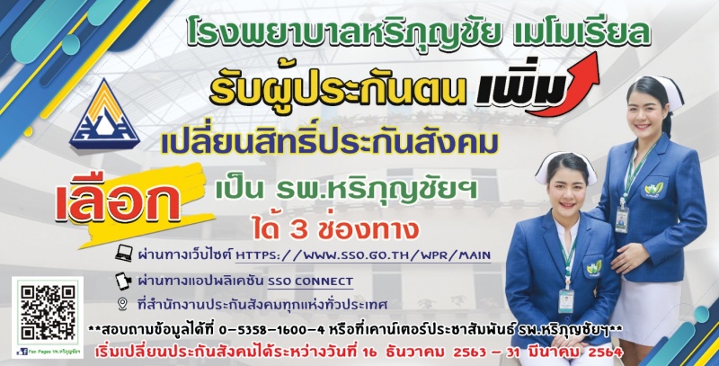รพ.หริภุญชัย เมโมเรียล รับผู้ประกันตนเพิ่ม ตั้งแต่วันที่จนถึง-31 มี.ค.2564 และเตรียมพบกับ รพ.หริภุญชัย ราม ตึก 8 ชั้น 180 เตียง เร็วๆนี้