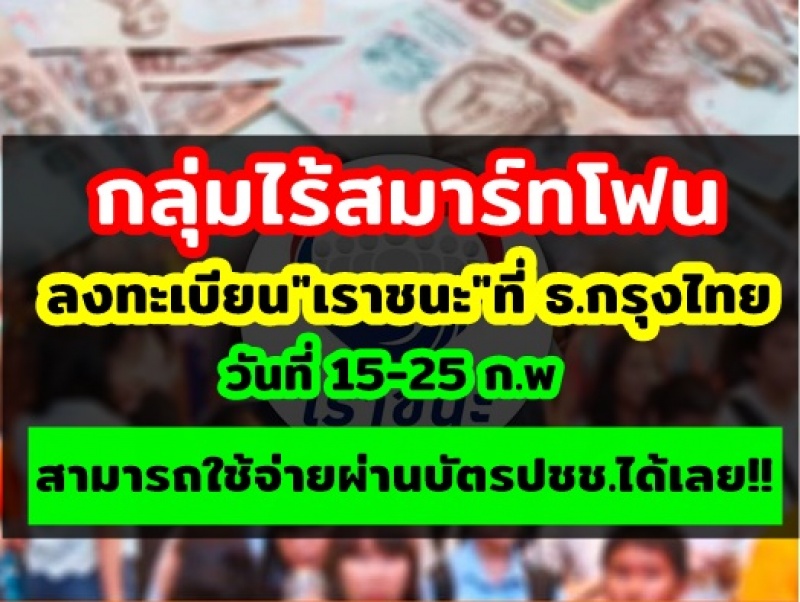 กลุ่มไร้สมาร์ทโฟน ต้องใช้บัตรประชาชนสมาร์ทการ์ดเท่านั้น ลงทะเบียน"เราชนะ" ได้ที่สาขาของธนาคารกรุงไทย วันที่ 15-25 ก.พ.นี้ รอรับสิทธิ 5 มี.ค.งวดแรกรับ 4,000 บาท