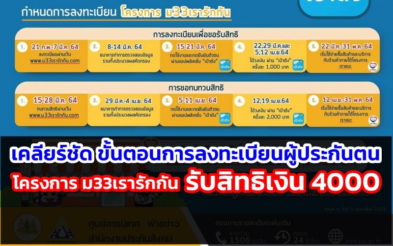 โดยจะเปิดให้ผู้ประกันตนที่มีคุณสมบัติ สามารถลงทะเบียนผ่านเว็บไซต์ www.ม33เรารักกัhttp://xn--q3c.com/ ได้ตั้งแต่วันที่ 21 กุมภาพันธ์ - 7 มีนาคม 2564