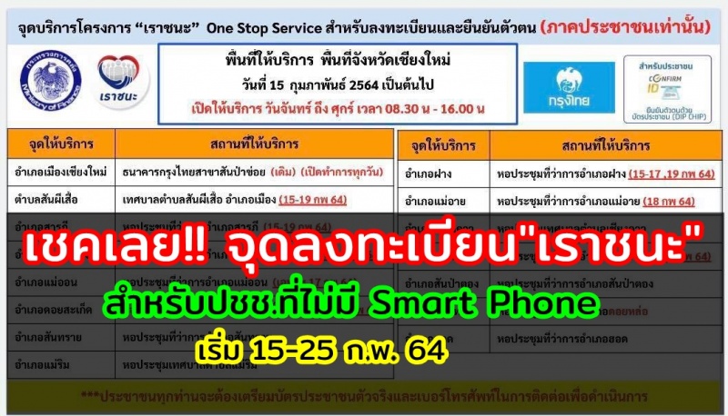 ประชาสัมพันธ์ การเปิดจุดรับบริการลงทะเบียนภาคประชาชน ที่ไม่มี Smart Phone ในโครงการ "เราชนะ" อำเภอเมืองเชียงใหม่ ระหว่างวันที่ 15-25 กุมภาพันธ์ 2564