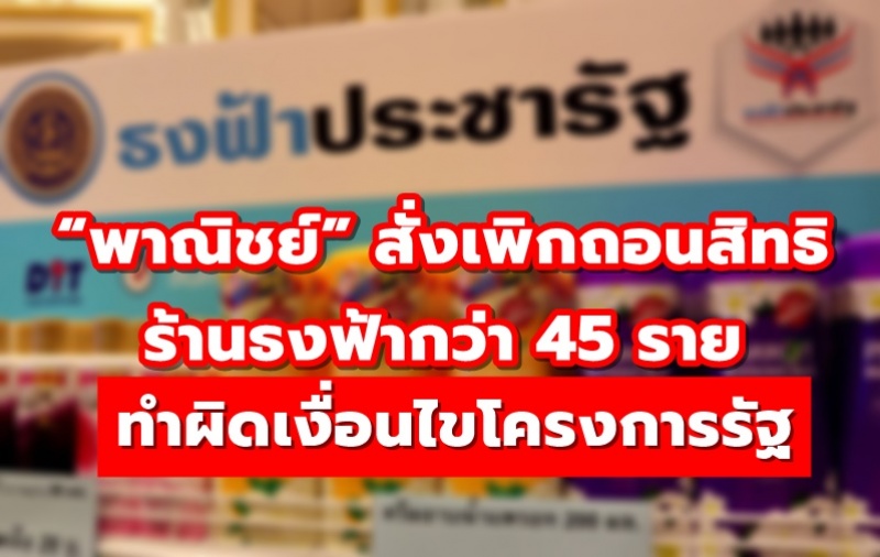 | • พาณิชย์ สั่งเพิกถอนสิทธิ ร้านธงฟ้ากว่า 45 ราย ทำผิดเงื่อนไขโครงการรัฐ |