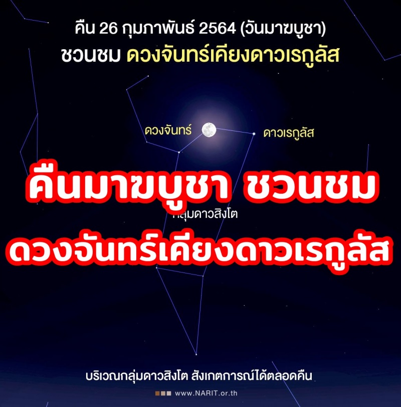 | • 26 ก.พ. 64 วันมาฆบูชาชวนชม ดวงจันทร์เคียงดาวเรกูลัส สังเกตการณ์ได้ตลอดทั้งคืน |