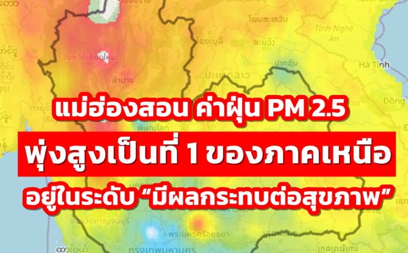 | • แม่ฮ่องสอน ค่าฝุ่น PM 2.5 พุ่งสูงเป็นที่ 1 ของภาคเหนือ อยู่ในระดับ มีผลกระทบต่อสุขภาพ |