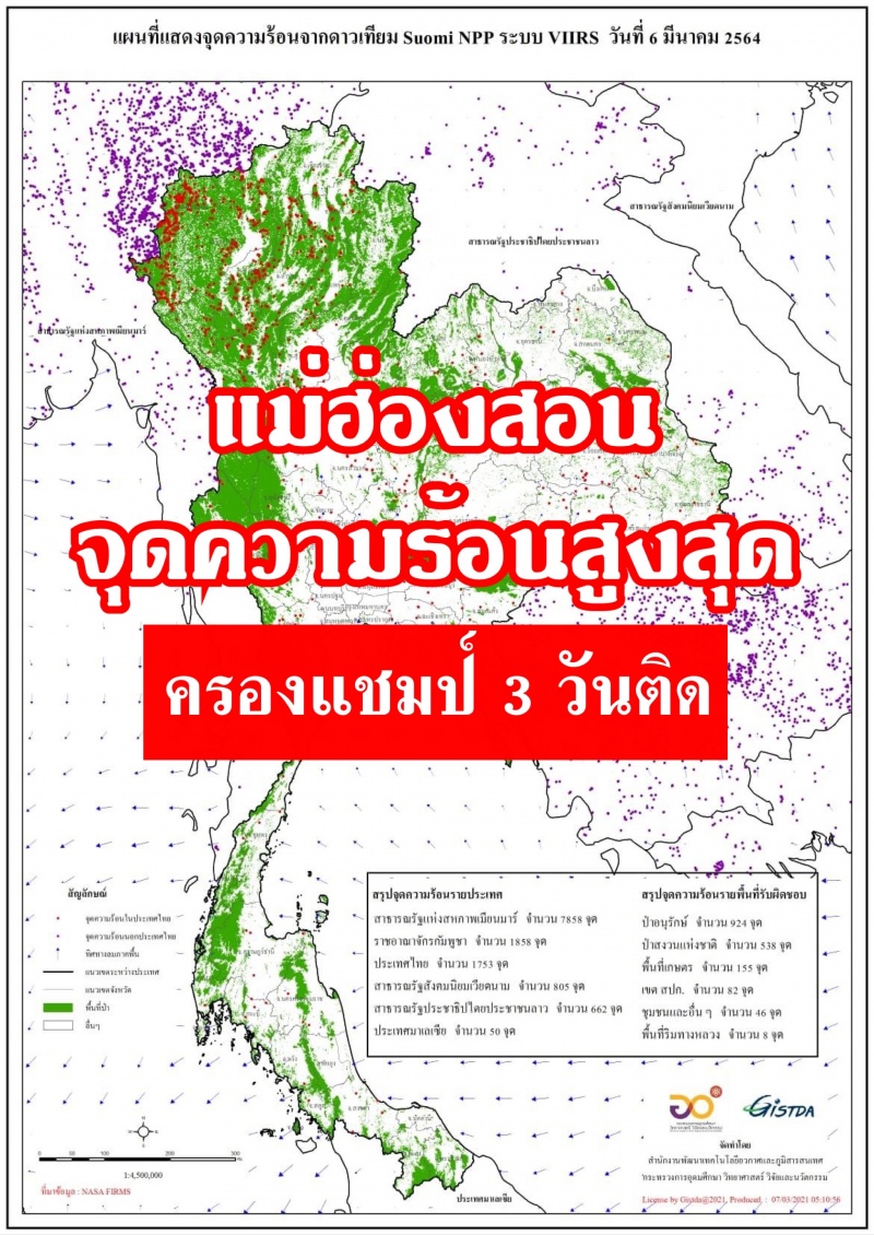 GISTDA เผยข้อมูลจากดาวเทียม Suomi NPP ของระบบ VIIRS เมื่อวันที่ 6 มีนาคม 2564 พบจุดความร้อนรวมทั้งประเทศ 1,753 จุด ภาคเหนือยังคงเป็นพื้นที่ที่พบจุดความร้อนสูงสุด โดยจังหวัด แม่ฮ่องสอน ที่พบจุดความร้อนมากถึง 570 จุด รองลงมาจังหวัด เชียงใหม่ 278 จุด และพื้นที่ของจังหวัด ลำปาง 193 จุด ตามลำดับ ซึ่งพบมากสุดในพื้นที่ป่าอนุรักษ์ 924 จุด พื้นที่ป่าสงวนแห่งชาติ 538 จุด พื้นที่เกษตร 155 จุด พื้นที่เขต สปก. 82 จุด  พื้นที่ชุมชนและอื่นๆ 46 จุดและพื้นที่ริมทางหลวง 8 จุด