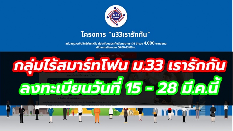 เตรียมเปิดให้ผู้ประกันตนมาตรา 33 ที่ไม่มีสมาร์ทโฟนลงทะเบียนวันที่ 15 - 28 มี.ค.นี้ เพื่อรับสิทธิ ม.33 เรารักกัน!!