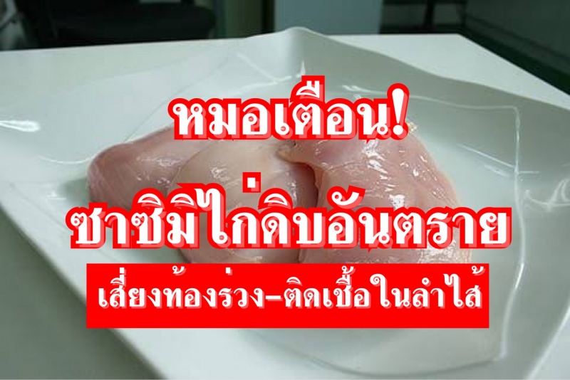 | • หมอเตือน! ซาซิมิไก่ดิบอันตราย เสี่ยงรับเชื้อแบคทีเรีย ท้องร่วง อาหารเป็นพิษ และติดเชื้อในลำไส้ |