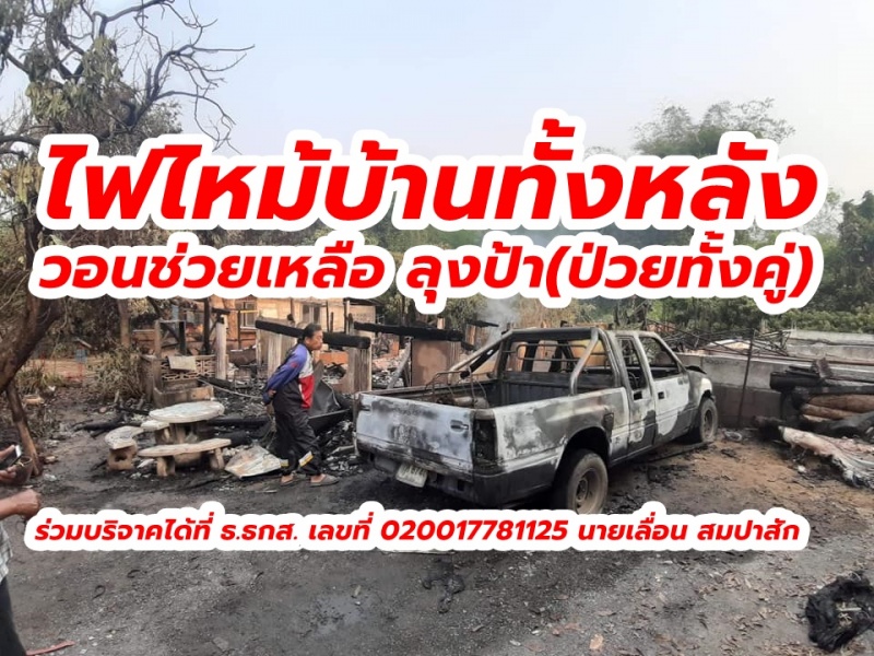 | • วอนช่วยเหลือ ลุงป้า(ป่วยทั้งคู่) ไฟไหม้บ้านทั้งหลัง @เวียงหนองล่อง ลำพูน ร่วมบริจาคได้ที่ ธ.ธกส. เลขที่ 020017781125 นายเลื่อน สมปาสัก |