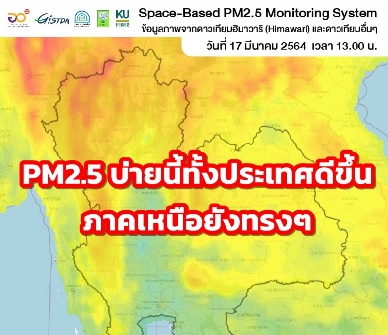 ข้อมูลภาพจากดาวเทียมฮิมาวาริ (Himawari) และดาวเทียมอื่นๆ ของระบบการติดตามปริมาณฝุ่นละอองขนาดเล็ก (PM2.5) ของวันที่ 17 มีนาคม 2564 ในช่วงเวลา 13.00 น.