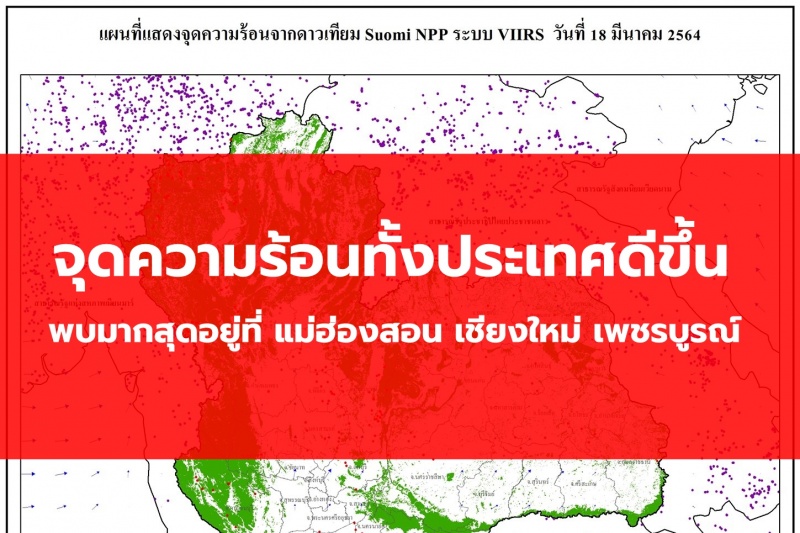 GISTDA เผยข้อมูลจากดาวเทียมซูโอมิ เอ็นพีพี (Suomi NPP) ของระบบเวียร์ (VIIRS) เมื่อวันที่ 18 มีนาคม 2564 พบจุดความร้อนทั้งประเทศ 507 จุด และภาคเหนือยังเป็นพื้นที่ที่มีจุดความร้อนมากที่สุด จำนวน 369 จุด โดย 3 จังหวัดที่พบจุดความร้อนมากที่สุด ได้แก่ 1.แม่ฮ่องสอน 134 จุด 2.เชียงใหม่ 65 จุด และ 3.เพชรบูรณ์ 46 จุด ตามลำดับ ส่วนใหญ่จุดความร้อนที่พบยังคงอยู่ในพื้นที่ป่าอนุรักษ์ และ พื้นที่ป่าสงวนแห่งชาติ