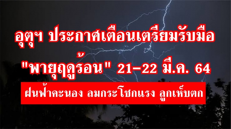 | • กรมอุตุประกาศเตือนฉบับ 2 วันที่ 21-22 มี.ค. 64 นี้ เตรียมรับมือ "พายุฤดูร้อน" มีฝนฟ้าคะนอง ลมกระโชกแรง ลูกเห็บตก |