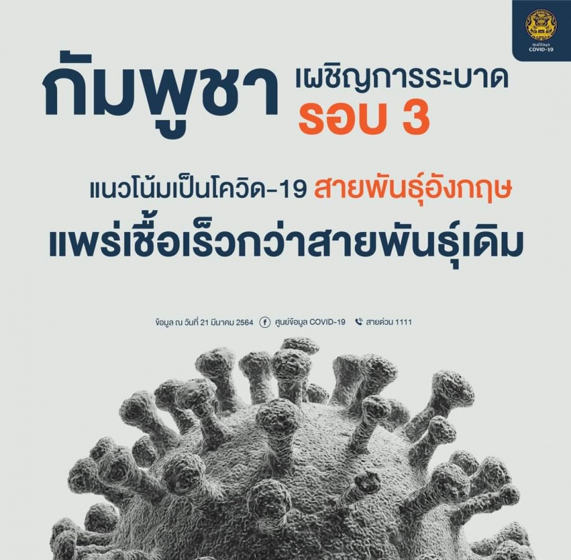 ราชอาณาจักรกัมพูชา เผชิญกับการแพร่ระบาดของโควิด-19 รอบ 3 ตั้งแต่วันที่ 20 กุมภาพันธ์ 2564 กระทรวงสาธารณสุขกัมพูชา เปิดเผยว่า การแพร่ระบาดของโควิด-19 ในรอบนี้ มีแนวโน้มที่จะเกิดจากการระบาด ของโควิด-19 สายพันธุ์อังกฤษ ซึ่งสามารถระบาดรวดเร็วกว่าสายพันธุ์เดิม “สถานการณ์ยังคงน่ากังวล ซึ่งทุกคน จะต้องใช้ความระมัดระวังเพื่อลดความเสี่ยงในการติดเชื้อโควิด-19 และลดการแพร่ระบาดโดยเร็วที่สุดเท่าที่จะทําได้”