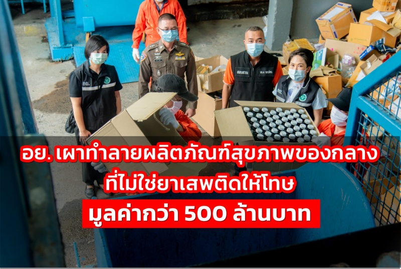 สำนักงานคณะกรรมการอาหารและยา (อย.) โดย นายแพทย์ไพศาล ดั่นคุ้ม เลขาธิการคณะกรรมการอาหารและยา และเภสัชกรหญิงสุภัทรา บุญเสริม รองเลขาธิการคณะกรรมการอาหารและยา พร้อมด้วย กองบังคับการปราบปรามการกระทำความผิดเกี่ยวกับการคุ้มครองผู้บริโภค (บก.ปคบ.) โดย พล.ต.ต. ณัฐศักดิ์ เชาวนาศัย ผบก. ปคบ., พ.ต.อ. สำเริง อำพรรทอง, พ.ต.อ. ศารุติ แขวงโสภา, พ.ต.อ. ศรีศักดิ์ คัมภีรญาณ, พ.ต.อ. ชนันนัทธ์ สารถวัลย์แพศย์ รอง ผบก.ปคบ., พ.ต.อ. เนติ วงษ์กุหลาบ ผกก.4 บก.ปคบ. ร่วมกันเผาทำลายผลิตภัณฑ์สุขภาพของกลางที่ไม่ใช่ยาเสพติดให้โทษ ที่ทั้ง 2 หน่วยงาน ได้ปฏิบัติการกวาดล้างร่วมกันในช่วงหลายปีที่ผ่านมา