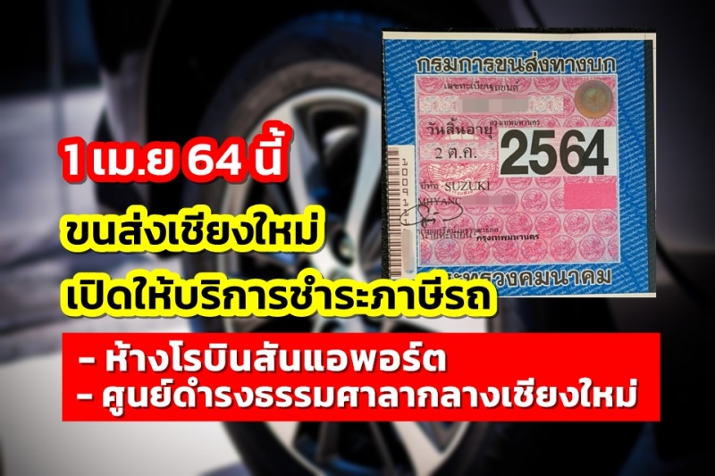 เริ่มตั้งแต่วันที่ 1 เมษายน 2564 ขนส่งเชียงใหม่เปิดให้บริการรับชำระภาษีรถประจำปี ณ ห้างสรรพสินค้าเซ็นทรัลโรบินสันเชียงใหม่ แอร์พอร์ต และศูนย์ดำรงธรรม ศาลากลางจังหวัดเชียงใหม่
