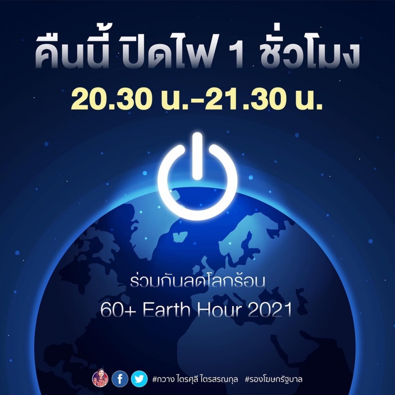 น.ส.ไตรศุลี ไตรสรณกุล รองโฆษกประจําสํานักนายกรัฐมนตรี เปิดเผยว่า พล.อ.ประยุทธ์ จันทร์โอชา นายกรัฐมนตรีและ รมว.กลาโหม เชิญชวนประชาชน หน่วยงาน ห้างร้าน ปิดไฟ 1 ชั่วโมง เพื่อลดโลกร้อน ตามที่การไฟฟ้าส่วนภูมิภาค , การไฟฟ้านครหลวง , การไฟฟ้าฝ่ายผลิตแห่งประเทศไทย , ร่วมกับ กรุงเทพมหานคร , กองทุนสัตว์ป่าโลก (World Wildlife Fund : WWF) ประเทศไทย , มูลนิธิสิ่งแวดล้อมศึกษาเพื่อการพัฒนาอย่างยั่งยืน (ประเทศไทย) FEED ฯลฯ พร้อมด้วยภาครัฐและเอกชน ร่วมจัดกิจกรรม “ปิดไฟ 1 ชั่วโมง เพื่อลดโลกร้อน” (60+ Earth Hour 2021) เพื่อกระตุ้นการมีส่วนร่วมของประชาชนทุกภาคส่วนให้ตระหนักถึงปัญหาสิ่งแวดล้อมและภาวะโลกร้อน โดยรณรงค์ลดการใช้พลังงาน ปิดไฟที่ไม่จำเป็น 1 ชั่วโมง ในวันที่ 27 มี.ค. ตั้งแต่เวลา 20.30 – 21.30 น.